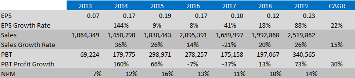 Bauto's EPS has grown rapidly over the past 7 years, achieving RM 0.23 per share in FY2019, which is more than THREEFOLD of its initial EPS (RM 0.07) in FY2013! Further, the consistent PBT growth (30%) is supported by the increasing revenue (15%) and increasing operating cash flow (29%).