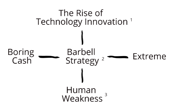 Nassim Taleb portrayed an image of barbell to describe a DUAL attitude in life by taking extreme risk aversion on one side and extreme risk seeking on the other, whilst eliminating all “moderate” risk attitude. In finance, with an investing barbell, one would have “high risk – high return” investment on one sleeve and “low risk – low return” on the other sleeve. No “medium/moderate risk” investment should be in our portfolio as Taleb argues that medium risks can be subjected to huge measurement errors.